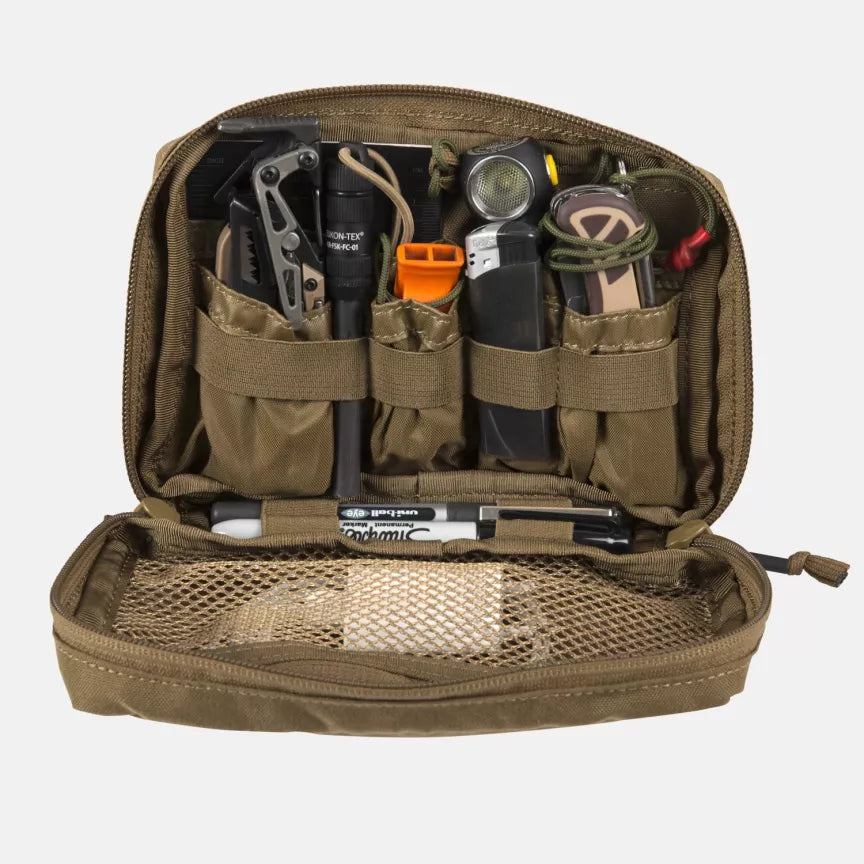 The Insert EDC Large is a handy organizer that helps transport and store essential items while keeping them organized. It can easily hold a knife, flashlight, pain relief medication, energy snack, and other small first aid items. Thanks to the internal pockets, you won't waste time searching and can quickly reach for what you need at the moment. The Insert EDC Large can be carried attached to a backpack, bag, or fanny pack using a hidden hook-and-loop panel.